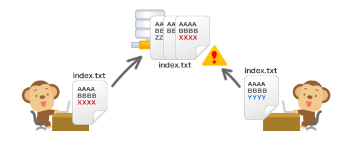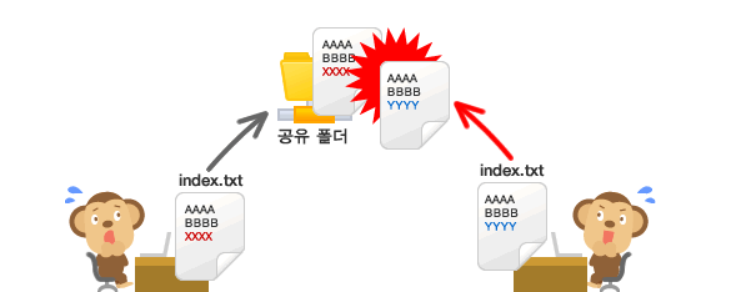- 내가 업로드할 파일이 누군가 편집한 내용과 충돌한다면, 서버에 업로드 할 때 경고 메세지가 발생해 편집한 내용을 덮어쓰기 되버리는 실수가 없어지게 된다
