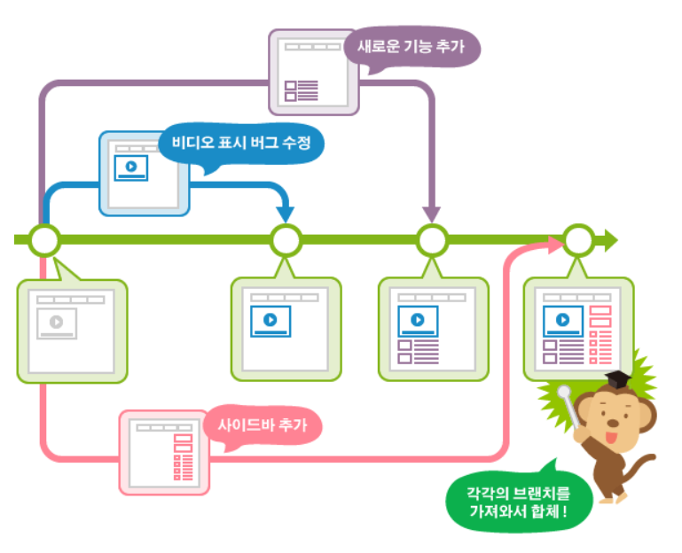 이럴 때, 여러 개발자들이 동시에 다양한 작업을 할 수 있게 만들어 주는 기능이 바로 '브랜치(Branch)'이다.