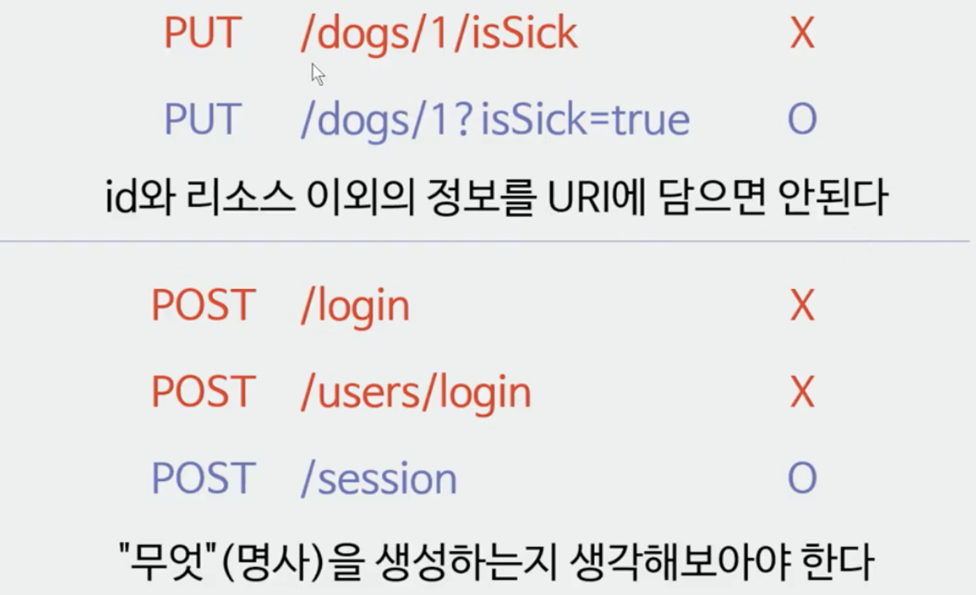 - X 표시가 되어있는것은 기존에 많이 이용하고 봤던 방식이며 절대 사용하면 안되는 것이 아닌 REST 방식이 아니라는 의미로 생각하면 된다.
